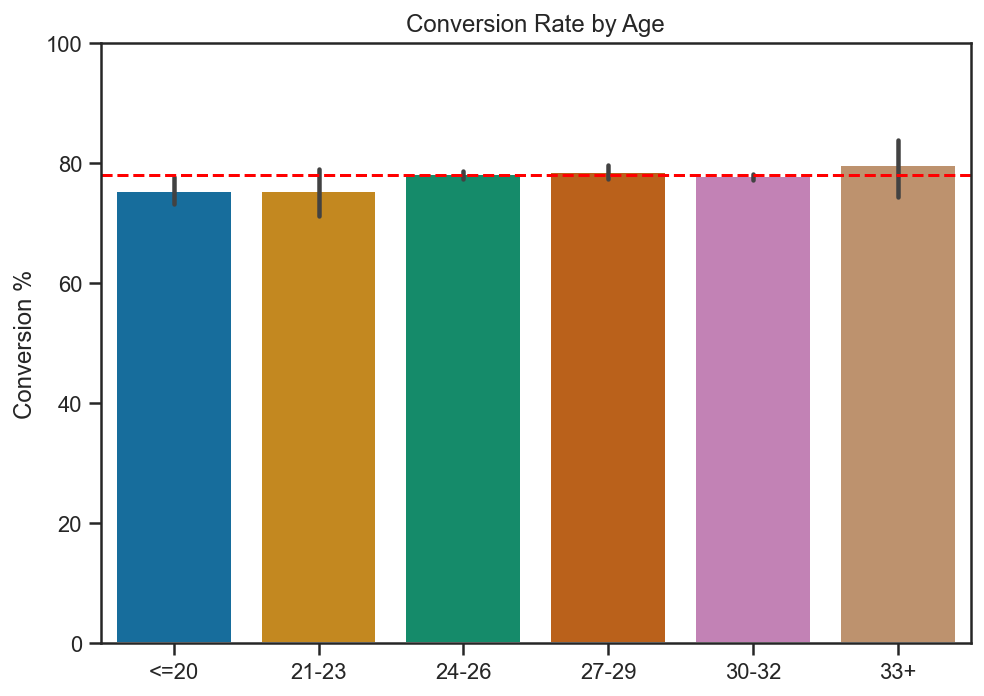 Note: Bars show predicted conversion probabilities with 95% confidence intervals. The dashed line indicates the overall average (~78%).