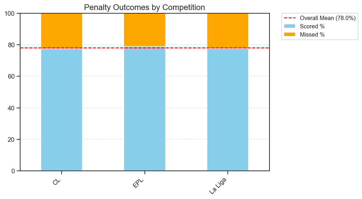 Unweighted (player) mean: This is the simple average of individual players’ conversion rates. Each player counts equally, no matter how many penalties they have taken. This measure answers the question: what does the “average player” in this group look like?