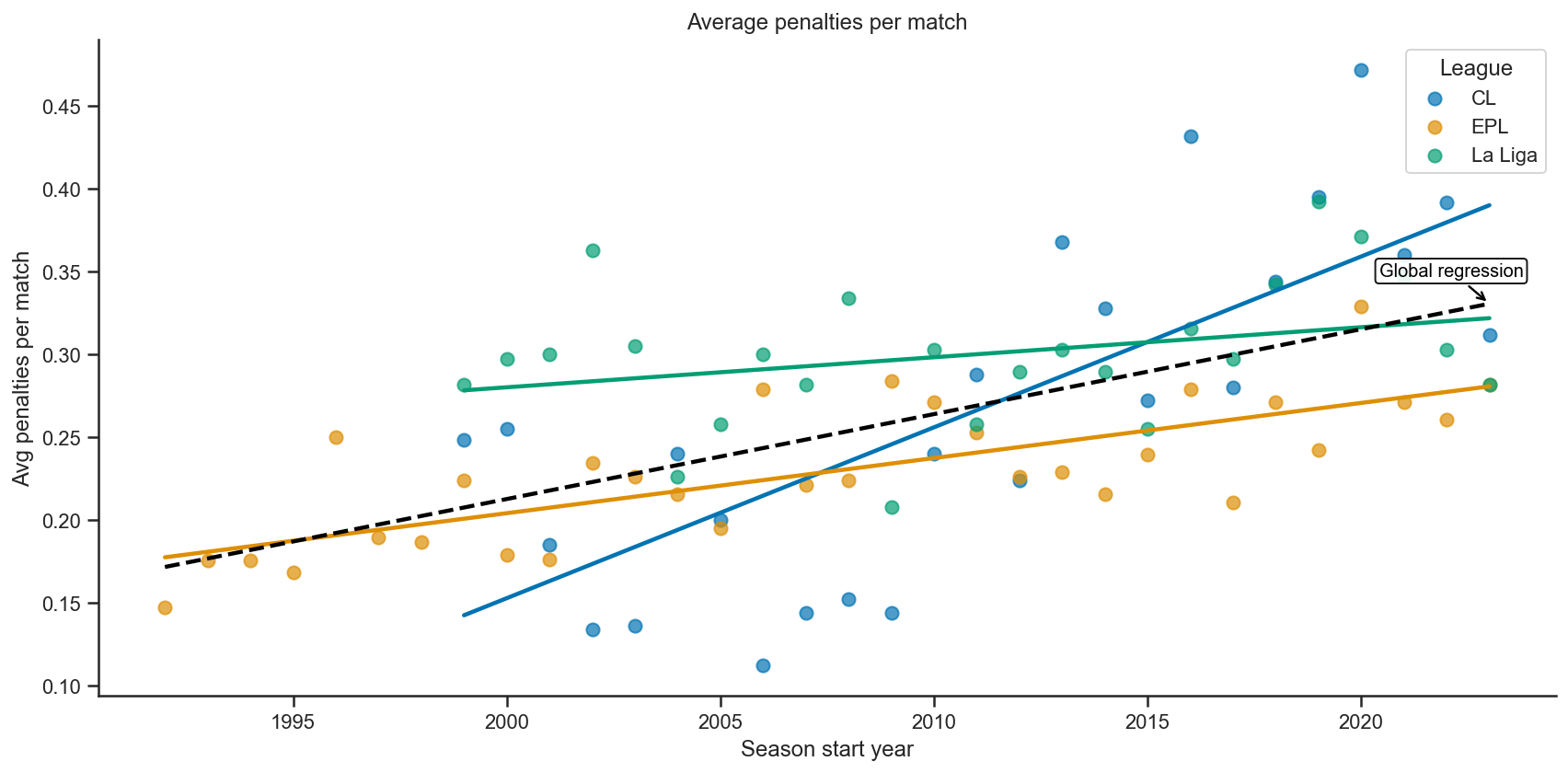 In the charts shown here, the main benchmark (red dashed line) is the weighted overall mean, because it reflects the actual outcome of all penalties taken across the dataset.