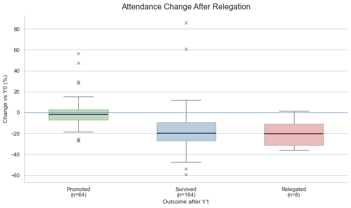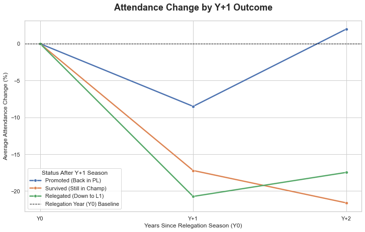 Survived (Blue Line): Teams that “survive” and stay in the Championship see a much larger initial drop of -17.2%. Worse, by Y+2, that optimism fades and attendance dwindles further to -21.6%.
