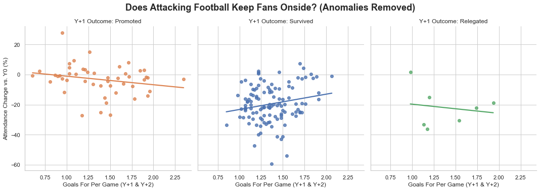 To test this, I’ve plotted Goals_For_Per_Game against the percentage change in attendance for all post-relegation seasons (Y+1 and Y+2), again grouped by the team’s outcome and with the stadium anomalies removed.